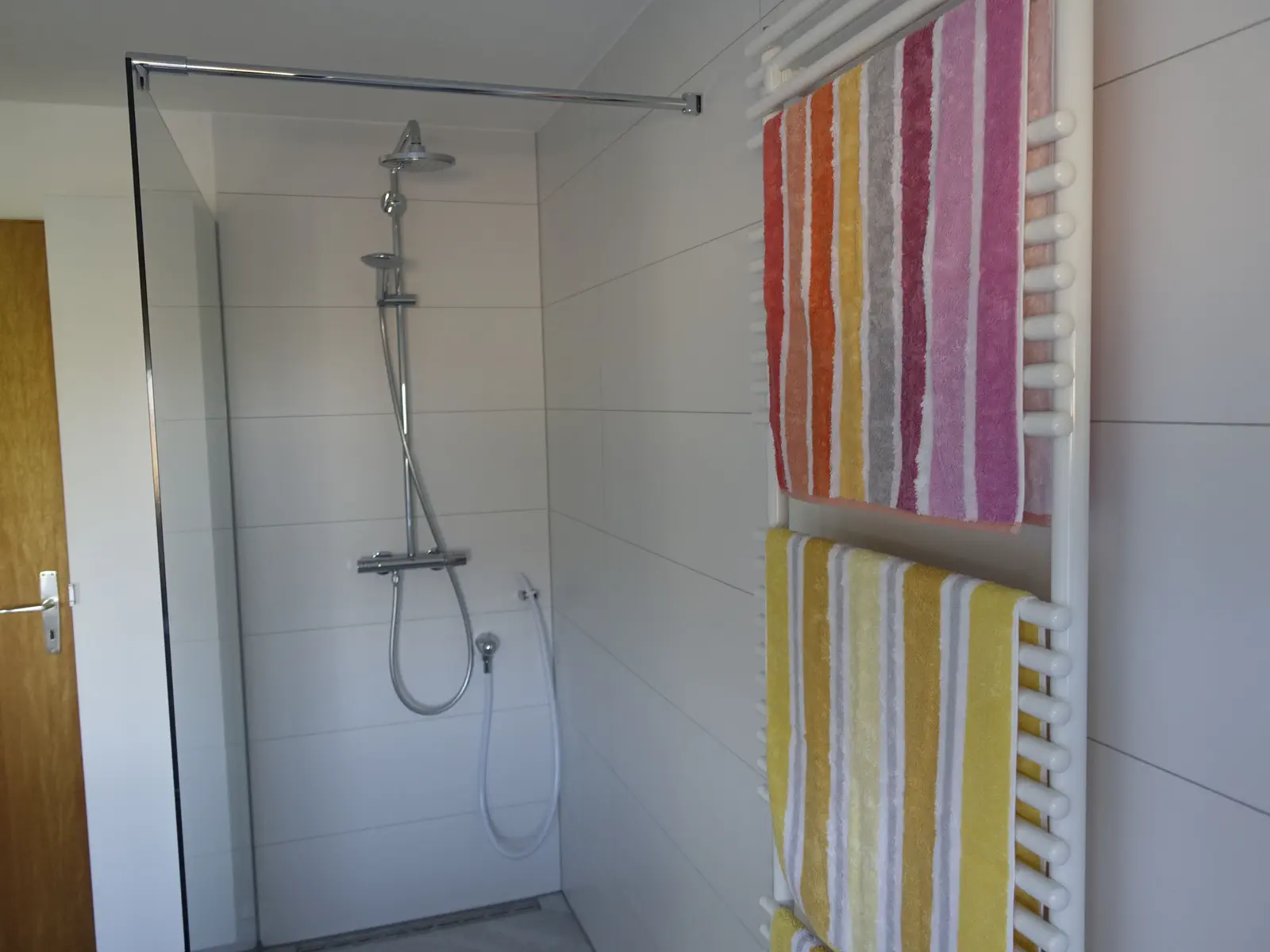 Das moderne Badezimmer mit Fußbodenheizung, bodengleicher Dusche und Badewanne lässt keine Wünsche offen. Bad und WC sind getrennte Räume.